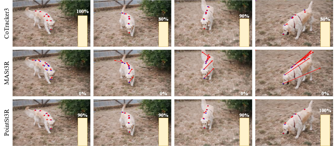Recent advances in foundational 3D reconstruction models, such as DUSt3R and MASt3R, have shown great potential in 2D and 3D correspondence in static scenes. In this paper, we propose to adapt them for the task of point tracking through 3D grounded correspondence. We first demonstrate that these models are competitive point trackers when focusing on static points, present in current point tracking benchmarks (+33.5% on EgoPoints vs. CoTracker2). We propose to combine the reconstruction loss with training for dynamic correspondence along with a visibility head, and fine-tuning MASt3R for point tracking using a relatively small amount of synthetic data. Importantly, we only train and evaluate on pairs of frames where one contains the query point, effectively removing any temporal context. Using a mix of dynamic and static point correspondences, we achieve competitive or superior point tracking results on four datasets (e.g. competitive on TAP-Vid-DAVIS 73.8 δavg / 85.8% occlusion acc. for PointSt3R compared to 75.7 / 88.3% for CoTracker2; and significantly outperform CoTracker3 on EgoPoints 61.3 vs 54.2 and RGB-S 87.0 vs 82.8). We also present results on 3D point tracking along with several ablations on training datasets and percentage of dynamic correspondences.